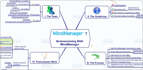 A common strategy for controlling this benign chaos is distributed cognition: the art of collecting thoughts in the order they emerge, reviewing them for priority or relevance, then reordering them for usefulness. One graphical approach is mind mapping, which can be done by hand, or with desktop software like MindManager or Inspiration. Mind maps are free-associated webs in which each node represents a a consideration, fact, detail or idea. The advantage of this scheme as that you can see entire array of your thinking in a snapshot, rather than drifting from thought to thought one at a time. Mind maps provide a more holistic framework for reflection.