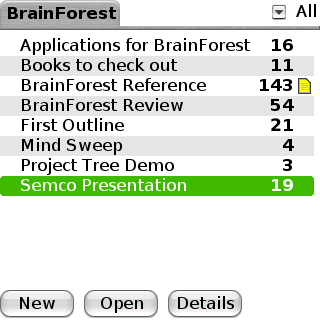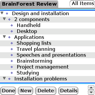 List making and outlining on the go may be the indended way to use BrainForest, but the desktop client (Note: Click on pic above to expand) is possibly even more useful. For instance, touch typing lecture notes into an outline on the desktop is faster and more ergonomic than thumb typing them into the Treo. Then the outline can be transferred, reviewed and editing directly on the device.