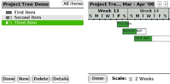 In Standard Tree mode, each item is considered an action with a checkbox to denote done/not done status. The alternative is Project Tree mode, in which each item is listed with a small bar graph to its left, indicating the percentage of completion. From the menu, you can select View Timeline and look at the project in mini-Gantt form.