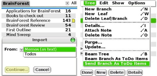 BrainForest allows you to import and export To Do lists and Memos, either whole or by category. Since I have my Tasks application mapped to my Calendar button, I found it handy to create a couple of generic categories called "Mind Sweep" and "Checklist." I dump random thoughts into the former, and items centering around a specific topic in the latter; then import these into BrainForest later for futher review or editing. Lists can be transferred as text, HTML, and for some reason, OPML (a file of collected links for RSS feeds).