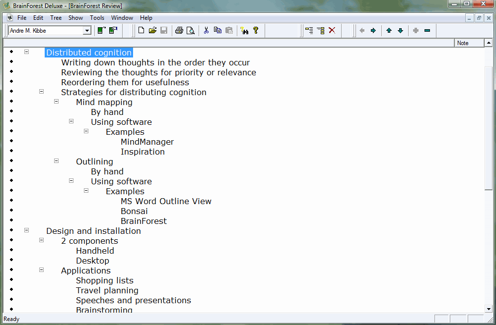 The few problems I had with BrainForest are almost identical with those of the other outliners: presumptuous defaults that can't be permanently changed. If you install it on Vista, be sure to run the installer from a non-Desktop directory to stay out of trouble.