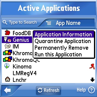 Here is the holding cell for suspect applications. The good news is that you can hold them here for as long as you need to and theyll never need good (or even mediocre) representation you dont even have to give them one phone call. Here again, clicking on the application will bring up a sub-menu giving you the choice of application information, activate the app (essentially de-quarantining it if thats even a word) and the option to permanently remove it.