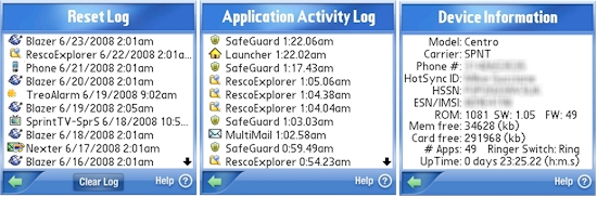 These areas of the app are of no less importance, however, they are pretty self-explanatory. If you would like to view the recent list of resets, click on the Reset Log you will be presented with the Application, Date and Time of the last 20 (unless you change the default number in the Program Options) reset culprits. By selecting the App Usage Log, you can view the last 20 apps that you used and when you used them. And lastly, clicking on the Device Info button will give you detailed information about your phone; Model, Carrier, Hot Sync ID, and various other bits of. Though it may not seem to be much it is nice to have such a thorough list of phone-specific information in one spot.
