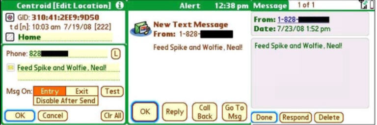 Below, I set a reminder to feed my two Shelties as I get home. When I arrive at my house, I receive the pictured text message reminding me to feed Spike and Wolfie - nice!