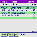 Library Assistant, by ieosoft, is a program to keep track all your books borrowed from the library with ALARM function. Even if your palm is off, when alarm is set, the palm will be power on automatically and display the book you need to return. If you miss the alarm, you will still be noticed by displaying about the book you need to return once you turn on the palm!