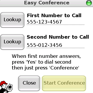 Here's one of those easily programmable, "Why didn't Palm think of that?" interface designs. Instead of making a conference call by making the first call, then dialing the second party while on the line with the first, Easy Conference takes a simpler approach. Its dialer screen allows you to look up and enter the first number, then the second; then you initiate the call by tapping the Start Conference button. When the first number answers, you press Yes to dial and start the second number, so that you're not looking it up during the call, then press Conference. It makes you actually want to use the Treo's three-way calling feature.