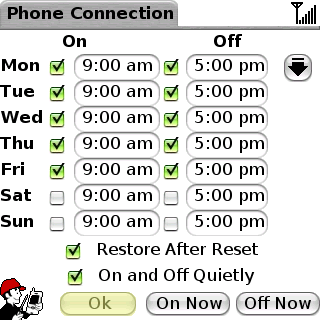 Another battery saver. This one turns the connection on or off, now or at scheduled intervals. You can either duplicate the schedule you set for Monday to apply through the rest of the week, or you can set the days individually. Phone Connection can automatically restore the connection after a reset, or deactivate the chime that accompanies the connection turning on or off.