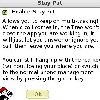 There's nothing more annoying than a call from the Emergency Room interrupting a good round of Sudoku. Check Enable Stay Put, and you can answer or ignore the call without leaving the current app. You can still use the End button to hang up, or switch to the standard dialer app with the Talk button.