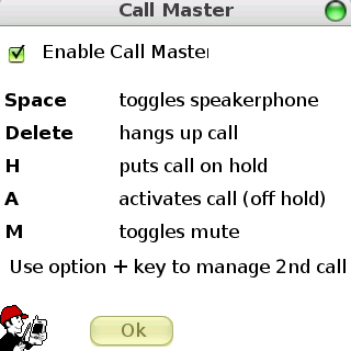 If you've resisted That Other Phone thus far, you're probably not enamoured of touchscreens. Call Master transfers call management down to the keyboard. The spacebar toggles the speakerphone, and the backspace key hangs up a call (not much advantage, being next to the End button). The H, A and M mnemonics take a little getting used to. The H and M are logical enough: Hold and Mute. The A is for "Activate," meaning "take off hold."