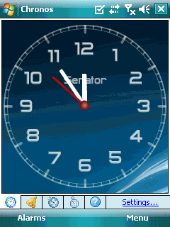 Chronos Alarm Clock, by Activekitten Ltd, fills a gap in PocketPC operating systems by offering an unlimited number of alarms and timers with customizable sound and time settings. You can select the sound file and volume. MP3, WMA and OGG files are supported. Two countdowns with lap times lets you track time spent on certain task. A skin-able clock with screensaver and chime sound allows you to have better control over your time.