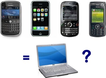 Alexander Wolfe from InformationWeek asks, "Can we really ditch our Windows-powered portables when we travel, in favor of BlackBerry, iPhone, Windows Mobile, or Symbian-powered handsets?"
