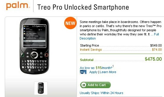 I read over the weekend via Treonauts that Dell is offering the Palm Treo Pro for $475 (before tax). Andrew posted this a couple of days ago, so I wasn't sure if Dell was still offering the Treo Pro at that price. I just now checked, and they are. So you can save $74 off Palm's official retail price. Not bad.