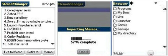 Some other handy features include the Txt to Memo button, which allows you to import text files from your memory card into the Memo Pad. You can also import or export any text file or memo size that you wish, defying Memo's 4,096 bytes limit. If you have added new memos, just hit the Refresh button and your memo list will reflect the latest changes. The Memo button will launch your Palm's native Memos app. Not bad for a freebie app, eh? Thank you, Suntzu, for bringing some pizzazz to our boring Memo app!