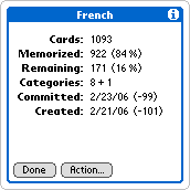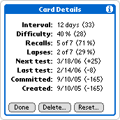 I've been using SuperMemo for Palm since the Palm III, longer than I've been using the desktop versions. The method and the app really do work as advertised, but it's not for everyone. Using SuperMemo requires more discipline than index cards. Since spaced repetition means that the app determines which cards you study each day, you can't select them yourself. You might feel like reviewing certain cards that aren't scheduled to be reviewed for several days, so patience is required. In spaced repetition, the optimum review time for a card is just when you're starting to forget the item - when your likelihood of answering it as a test question drops to 90% according to the forgetting curve.