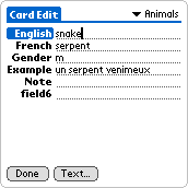 The Card Edit screen has a Question field, and Answer field, and four Note fields. The note fields are useful if you want to add supplementary information, like the gender or phonetic spelling of a foreign vocabulary word. In the top right is the menu for assigning the category to the item.