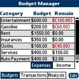 - With Budget Manager you can easily plan and create budgets to track you expenses, your incomes and your savings. With the Budget summary screen you can easily monitor your budgets and compare the current month to your last month information. With the Transactions screens it is simple and fast to manage your transactions, assign them to your budgets, and view them by budget and/or time periods.