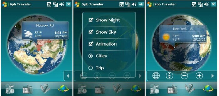 I watched Sbp Software's video of Spb Traveler's features, and the animated Globe looks really cool. The Globe displays actual real time sky images on top of the globe. It also shows sunny and cloudy parts of the planet, plus night shadowed regions. If you have trips scheduled in Traveler, your trips show up on the globe also.