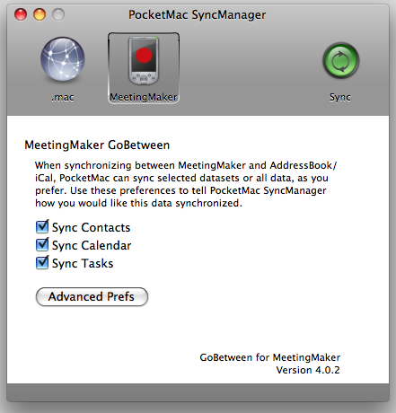 Let's be honest...even as great as Apple's iSync (Sync Services) is, it's limited. If you have an iPhone or any of the other devices it supports and you want to sync using Apple's native OS X Address Book or iCal, you're all set. However, if you depend on Meeting Maker for your contacts, calendars & tasks, you were stuck...until now.