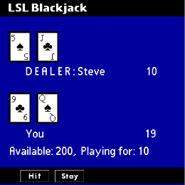 LSL Blackjack is the simple card game that follows most of the rules of the Nevada Casinos (double down, split pairs, 1 deck cards, etc). Its just you and the house playing. To get started just select your dealer (either Steve, Sandy or Tommy), define your bet, and start playing.
