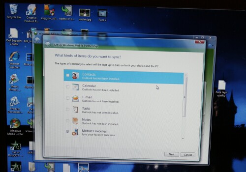 I use my Palm Centro more than my Treo Pro, so taking a ride with the Fuze was a whole different world. The first couple of days were conFUZing for me because I couldn't get the Fuze to sync with either or my computers. I have a Windows XP desktop PC and a Windows Vista laptop. I have my Treo 680 and iPod Touch connected to my desktop PC, along with several other devices, so I thought it might be best to sync the Fuze with my laptop, which I've only used to sync my Palm Centro. Sounds simple. Well, the Fuze didn't ship with a software CD so I had to find the syncing software and download it. I found that I'd need to download Windows Mobile Device Center (WMDC), which takes the place of Microsoft Active Sync on Vista computers. So I found the software and downloaded it on my Vista laptop. I connected the USB sync cable to the Fuze and my laptop and but the WMDC didn't open up. I had to find it on my computer under Start/Programs. There was supposed to be a WMDC icon in the taskbar. So, obviously WMDC wasn't finding or connecting to the Fuze. There was a message in the lower left corner of the WMDC window that said, "Not Connected". So I unplugged the sync cable, soft reset the Fuze and rebooted my laptop. That didn't make a difference though because the WMDC still didn't connect to the Fuze. I decided to try to sync the Fuze with my desktop PC. I had no luck there either. I even did the same thing; rebooted and soft reset the Fuze. I even uninstalled ActiveSync and reinstalled it and plugged my USB cable directly into my computer instead of plugging it into my hub as I had been doing.