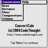 Once again, it's developers in the Palm community that make life more fun and interesting for the rest of us. A well-deserved thanks goes out to David Orriss, Jr. of www.codethought.net for taking the time and using the know-how to give ConvertCalc freely to the rest of us. Download it today and never wonder again how many square kilometers are comprised of 27 square miles (69.92967897918 square kilometers, to be exact).