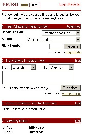 KeyToss, a fast-growing mobile web portal, announced its first steps into the travel services market with a new set of tools targeting business and leisure travelers. These tools, which include Flight Status, Translations, Currency Rates, and Snow Conditions, offer a level of customization not offered by other mobile services: