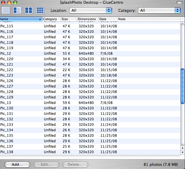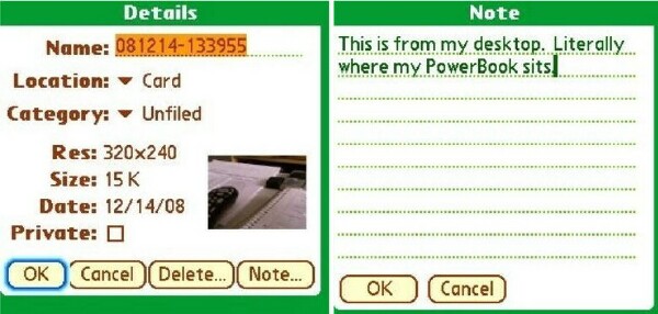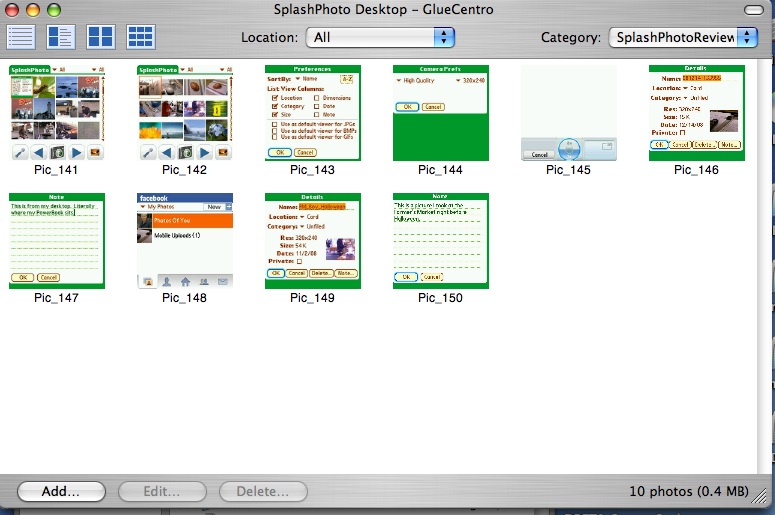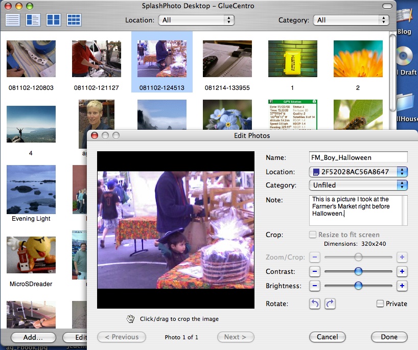 Another huge benefit of using SplashPhoto is that you are given a Desktop app that can help you organize your photos and do some modifications (crop and edit, adjust brightness and contrast, and change the Name, Category, and Location). When you HotSync, the Centro and Desktop catalogs will match.