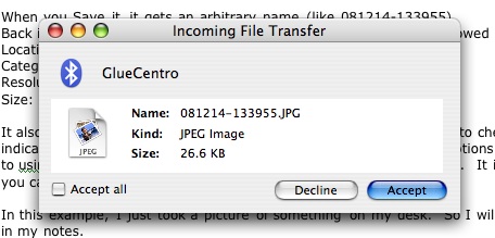 When I tapped Bluetooth, it "discovered" my Mac. After hitting OK, I immediately saw a pop-up screen on my Mac telling me that file 081214-133955 was about to be transferred. It gave me the option to accept or reject. So I accepted.