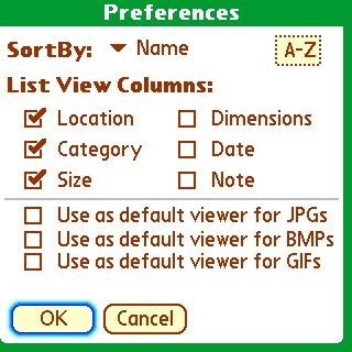 Setting preferences is easy to do. From the Centro, I just hit the button to bring up the menu. Reading from left to right, you will see Options, Albums, Prefs. D-Pad or tap on Prefs (or just hit Menu P). You will get several options for what is included in the List View (Location, Category, Size, Dimensions, Date, Note).
