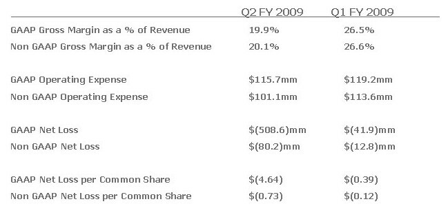 The second quarter of fiscal year 2009 net loss applicable to common shareholders included a non-cash charge with a net impact of $396.7 million to the tax provision pertaining to the increase of the valuation allowance for the Company's U.S. deferred tax assets. This non-cash charge was the primary driver of a net loss applicable to common shareholders for the second quarter of fiscal year 2009 of $(508.6) million, or $(4.64) per diluted common share on a GAAP basis. The increase in the valuation allowance does not reflect a change in Palm's outlook, nor does it alter the company's ability to utilize the underlying net operating loss carry forwards.