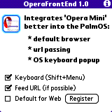 Are you using Opera Mini on your Palm, Treo or Centro? Then, OperaFrontEnd, by MetaViewSoft, will change your experience with Opera Mini. Ever thought about making it to the default browser? Ever tried to get rid of Blazer? Ever wanted to have links open in Opera Mini right away from your Email App? Well, OperaFrontEnd does all this.