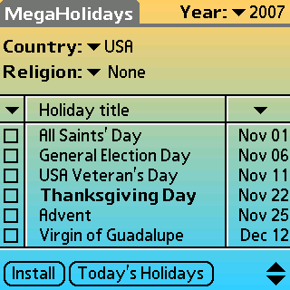 There is a fair chance you waste your time if you happen to be in a foreign country on business during local or national holidays. MegaHolidays program will let you effectively schedule your trip to any country of the world. This application will remind you of the upcoming holidays, and what`s more, it will let you enhance your cultural awareness by researching the origin of a holiday and comparing it to other holiday customs of the world. You can also add any selected holiday to Date Book for further reminder, or export the necessary holiday information into your Memo Pad for reference.