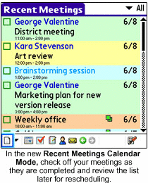 - In the new Recent Meetings Calendar Mode, check off your meetings as they are completed and review the list later for rescheduling.