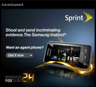 I'm back again with more Treo/Centro sightings! Palm smartphones continue to pop up on television and movies. I get a sense of pride each time I see a Palm smartphone on the small or big screen. Ah, remember when Jack Bauer on "24" used his mighty Treo in his quest to keep the U.S. safe from terrorists? Chloe would send Jack photos of suspects to his Treo. Jack could also have blueprints of buildings and GPS directions sent to his Treo. Sadly, I read in the TV Guide that Jack will be using a Samsung Instinct this season. Why Jack, why? Below is a Sprint ad I saw over to the side of the viewing screen while watching "24" online. I haven't seen Jack using an Instinct yet. So far, he's been using some sort of flip phone that I can't identify.