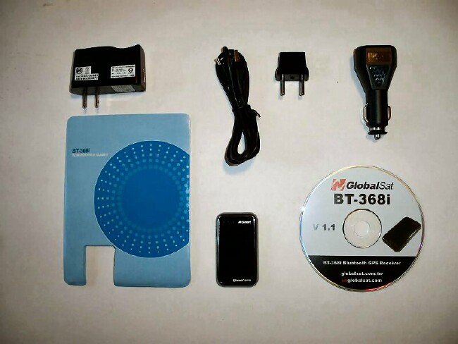 The BT-368i package contents included the BT-368i, a 110V AC wall charger, a US-to-EURO wall adapter, a 12V DC car charger, USB charger cable, a reference sheet and a CD-ROM containing a user manual and GPS info test utility.