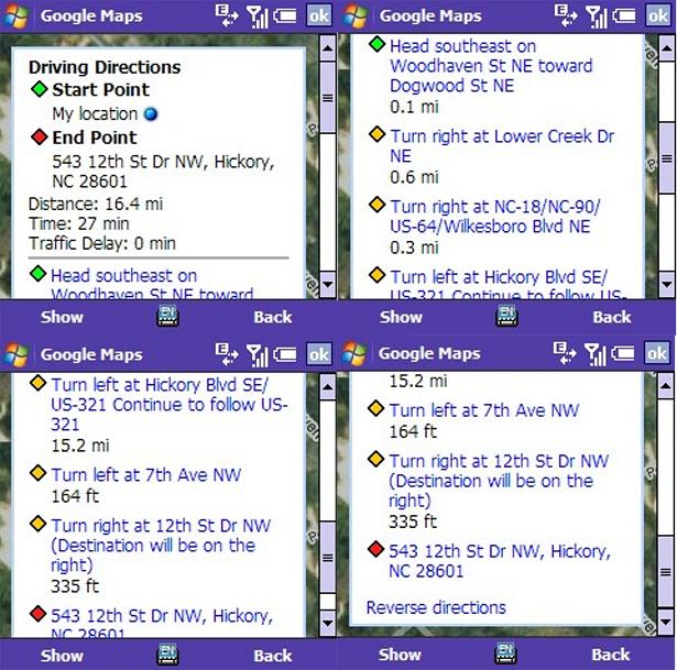 The Directions option works fine for me, as it always has when using just Google Maps with no GPS device. The only difference is that I have a real-time tracking of my location as I move and carry the BT-368i with me. I plotted at least 8 different routes to places I already know the best route to, and the BT-368i/Google Maps combination pretty much gave me the shortest routes available. Of course, I tend to take a few back roads and my routes may seem unconventional to most - especially to a device that uses strict guidelines when plotting a course. Below I've pictured directions from my house to a place I worked for years back and also a snapshot of the course in progress.