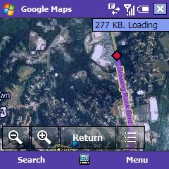Once Google Maps was running and the 2 devices were communicating, I was presented with my location - represented by a blue dot. I chose 'Use GPS' from the options menu and the combined devices were soon connected to/communicating with 7 satellites. As a test, I drove around for about 10-15 minutes - noting that as my location changed, the blue dot would soon update to represent my new location.