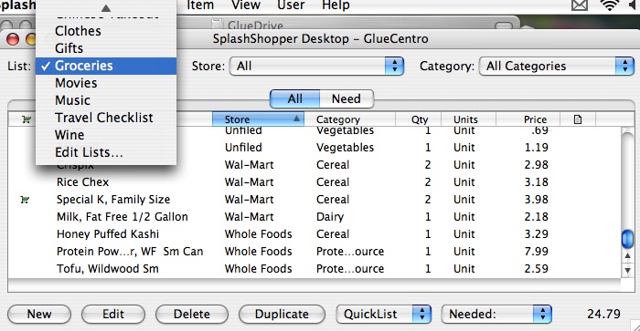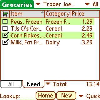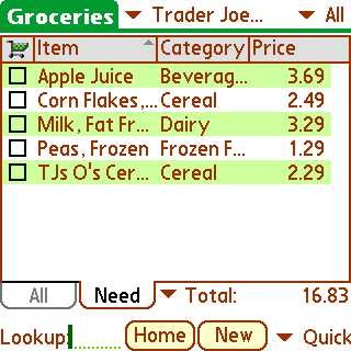 Time to see how well the desktop app talks to my Centro. After performing a HotSync, I loaded SplashShopper. The Home page displays a list of all the Shopping Lists. So I clicked on Groceries and was presented with a neatly displayed listing of All products from the list I created on my desktop. I was especially pleased to see the alternating green and white background for the rows of items which made the list very readable on the Centro's little screen.