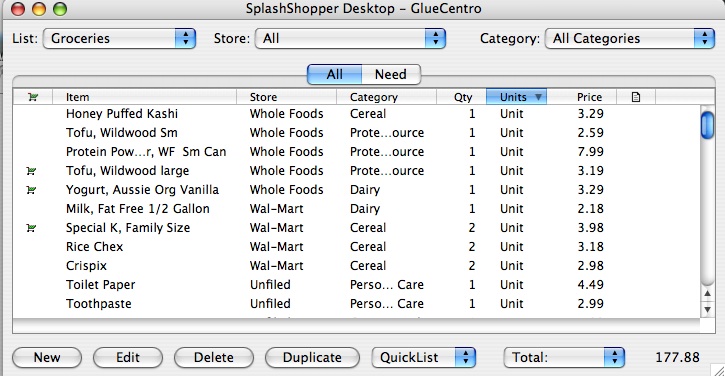 I kept Store (i.e. Trader Joe's, Safeway, etc.), Category (i.e. Dairy, Cereal), Quantity, Unit (Bag, Bottle, Can, etc.) and Price. I have certain items I buy at certain stores - like frozen peas at Trader Joe's, and my Aussie yogurt at Whole Foods. So I really like this idea of having one list that can be filtered/sorted per store.