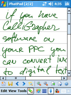 If you have CalliGrapher handwriting recognition software installed on your Pocket PC and/or PenOffice software on your Desktop PC or a Tablet PC with Microsoft handwriting recognition software, you may use it to convert your handwritten notes to digital text. You can also search your handwritten notes for specific characters or words. PhatPad also supports the standard Microsoft handwriting recognition engine available on Tablet PCs and in Windows Vista Ultimate Edition.