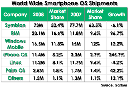 - The Symbian OS is a runaway winner with right around 50% share of market for Q4 and the year. However, their 2008 numbers were 6% lower than 2007.