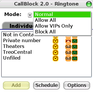 Unfortunately, CallFilter was extremely buggy on the Treo 650 and later Treos. The original developer apparently was unable or unwilling to upgrade from the 600. Things may have changed, since the app is marketed for the 600 and 650, but I have a Centro. After a desperate search, I stumbled across the solution that promised to rescue me from my call screening woes, CallBlock Ringtone Edition.