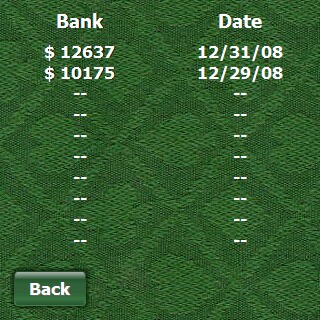 If you should have a good game and make the top 10 high scores, the game has a high score screen which displays the bank dollar amounts and also the date the scores were obtained. This could be handy for when you're on a losing streak and wish to relive your 'glory days', J/K! I suppose it can be used for bragging rights, though.