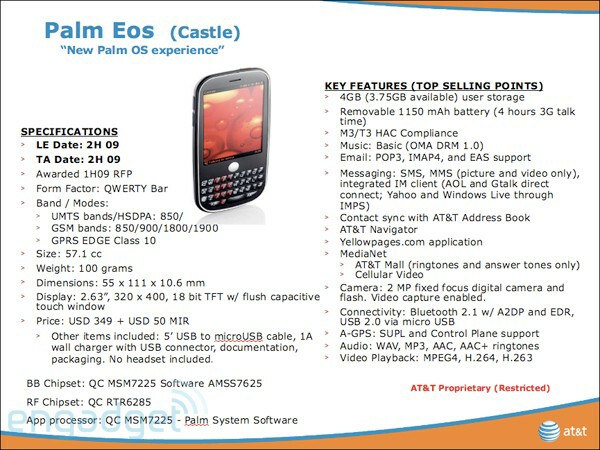 Our sister site PreCentral.net is reporting that Engadget has gotten their hands on an AT&T slide showing the Palm Eos coming in the second half of 2009.
