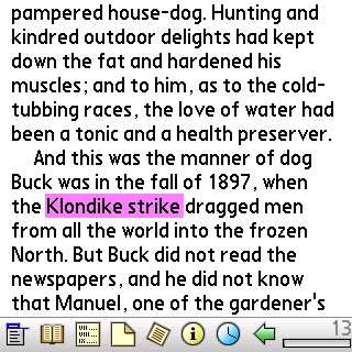 The Find function, which can be triggered by using Menu-F (It is part of the submenu that appears Go on the top of the screen), is actually quite speedy. To test it, I advanced 30 or so pages into the eBook and then asked for it to find "Klondike." It first went to the Klondike word I highlighted. When I did "Find Again," it skipped up to page 205. Awesome!