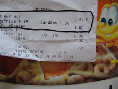 When I got to Safeway, I found that the large box of Honeynut Cheerios had already been discounted to the card price of $3.49 (from $4.99). Curious, I grabbed the box and handed my Safeway card to the checker, who scanned it and then the cereal box. Then she did a double-take. Clearly she didn't know about the Cellfire deal but there it was: Mfr. eCoupon 1.00-