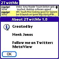 According to the PUGcaster, Metaviewsoft is currently working on a full featured twitter client for the PalmOS Platform. blog post, he wrote about getting a sneak preview of 2TwitMe, which runs on all Palm OS5 devices without hassle.
