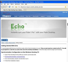 PC Magazine's Jamie Lendino took a look at Chapura Echo for Palm Desktop 6.2.2. This program takes the hassle out of syncing a Palm Pre with Palm Desktop. It provides complete two-way synchronization transfers essential information between the Palm Desktop Date Book and Address Book and the corresponding Pre applications. And it uses WiFi, which is a real plus.