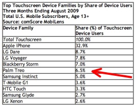 comScore, Inc released a study of touchscreen mobile phone adoption in the U.S. To no surprise here in the Palm world, it looks like touchscreen phone adoption is growing rapidly with year over year numbers indicating an increase in touchscreen usage of $159%.