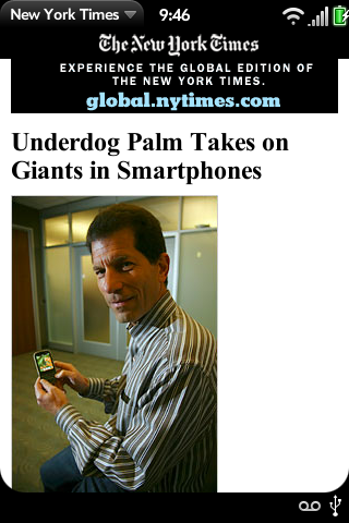 At the crack of dawn, Yahoo! Finance made note of a story about Palm appearing in The New York Times titled "Underdog Palm Takes on Giants in Smartphones."